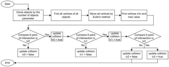 As one of the most effective techniques for real-time applications, collision detection has been widely used, especially in computer graphics, games, computer animation, virtual reality, augmented reality, and 3D graphics []. To develop and detect a well-geometry structured 3D and an accurate real-time simulation, collision detection plays a critical role in intersecting and reaching objects adaptably and effortlessly. Collision detection is utilized to determine objects intersecting with each other in a simulated environment. The Octree axis-aligned bounding box (AABB) [] represents a geometric bounding volume hierarchy (BVH) in 3D spatial subdivision for the simulation of the rigid objects that are characterized by a pair of objects intersection between the minimum point and maximum point []. If the minimum value of AABB exceeds the highest maximum value of the other along any axis, there is no collision along that particular axis. Conversely, if the maximum value of one AABB is less than the minimum value of the other along any axis, they cannot be colliding along that axis, as collision-free detection occurs at any pair between two objects. If the conditions do not meet the criteria for each of the three axes, the AABB intersections are considered to have collided.