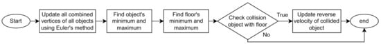 After implementation, all combined vertices of all objects are moved by applying the explicit Euler physical-based method. The object and floor maximum and minimum bounding boxes are determined if there is an overlap between the AABB intersection. After collision detection occurs, the reverse velocity of particles colliding with the floor in the object is updated to make an object movement animation as shown in Figure 3.