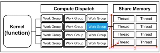 Parallel hierarchical computation on the GPU speeds up performance, detection, and mathematical operations due to the nature of hardware platforms. The GPU-based algorithm utilizes parallelism to accelerate collision detection processes, such as general-purpose computing and simulation, by parallelizing the task massively and parallelly in hundreds of threads []. The Unity3D game engine is used widely in game development to render pipelines and conduct physical simulations using high-level shader language (HLSL). HLSL is essential for the GPU implementation and design of the programmable shader script operating on virtual works groups comprised of small execution units (cores). The C# programming language is used for scripting to perform operations sequentially. Its efficiency can be enhanced through multi-threaded computing. Shaders are programs tasked with the rendering of graphical data. Within Unity3D, the compute shader expands upon Microsoft Direct3D 11’s technology to develop cross-platform applications. The Unity3D engine allows for the creation of a compute shader using a regular script. When invoking or running the application, it calls the dispatch method, which then activates the kernel program for execution within the C# script. The compute shader function is a kernel program specified by the number of workgroup blocks, with each workgroup block being generated by multiple threads. Moreover, the compute shader function as a kernel program is implemented by the number of threads with three parameters on the x, y, and z dimensions of the 3D vectors. The three parameters are represented as one-dimensional, two-dimensional, or three-dimensional computational tasks in parallel. The total number of threads is the product of the three parameters of the dispatch function. Therefore, the execution of all threads occurs in a non-sequential order, providing an advantage in performance, especially when handling extremely large data as demonstrated in Figure 4.