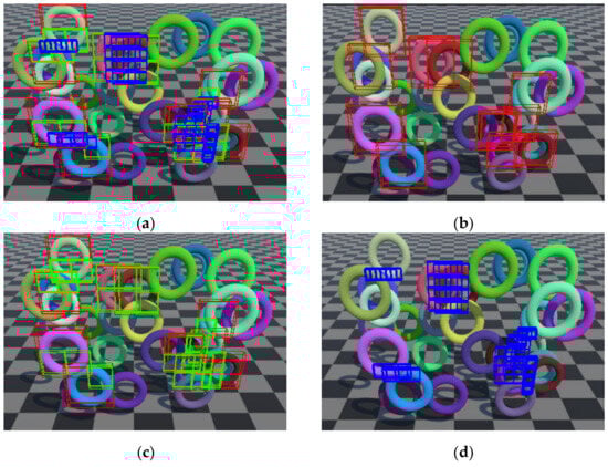 Experimental results from the Torus objects: (a) result of collision detection at all levels in Octree structure, (b) result of collision detection level zero, (c) result of collision detection level one, and (d) result of collision detection level two.