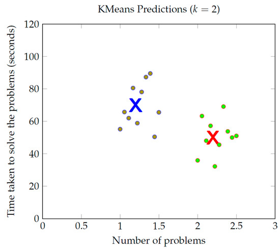 Figure 3 shows the predictive analysis of the time taken to solve the problems by applying K-means clustering, with k = 2. The x-axis denotes the number of problems, while the y-axis represents the time taken to solve them in seconds. Each data point on the plot signifies an observed scenario. Two distinct clusters of data points are visualized, and they are distinguished by different colors (blue and red) and letter labels (“X”). These clusters represent the different prediction scenarios or outcomes derived from the K-means algorithm (see Figure 3). The modifications applied to the y-coordinates of the data points indicate the varying predictions or adjustments made during the analysis. This scatter plot serves as a visual aid to understand the relationship between the number of problems and the corresponding time taken for their resolution, providing insights into predictive modeling outcomes in problem-solving scenarios (see Figure 3).