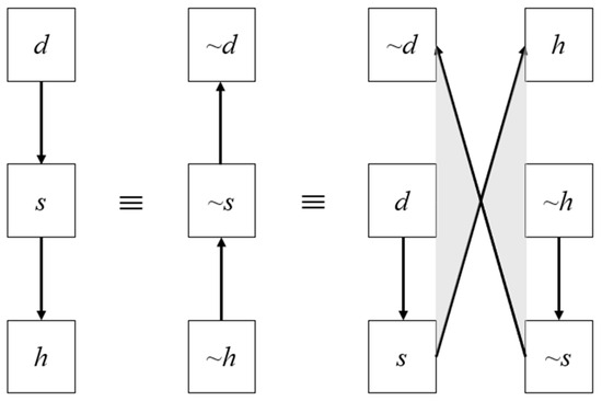The Butterfly Diagram visually represents the relationships between the three elements (d, s, and h) and serves as a tool for contradiction analysis. This diagram illustrates how desired functions interact with system states and how these interactions can lead to undesired effects. This diagram likens the elements d, s, and h to the wings and body of a butterfly. The left wing shows the desirable function (d) and the changes in the system state (s) it causes, while the right wing displays the harmful functions (h) that may arise from the system state. The body of the butterfly illustrates how these elements interact, and strategies to adjust these interactions are sought to resolve the problem when necessary. According to the contraposition law in logic, (d → s) ≡ (~s → ~d), (s → h) ≡ (~h → ~s), and (d → h) ≡ (~h → ~d). This process is illustrated in Figure 1.