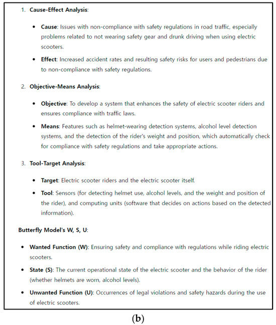Next, to find problem-solving strategies for specific situations, patent data were summarized and analyzed using ChatGPT, and patent metadata were constructed. The process involved providing patent documents to ChatGPT to complete the analysis of cause and effect, objectives and means, as well as tools and targets. Metadata were then constructed with attributes for cause, effect, objective, means, tool, target, and keywords. After training ChatGPT on the Butterfly Model, a search for patents related to “electric scooter safety” was conducted. The analysis results of the patent documents showed contradictions appropriately, and the problem’s cause, effect, objective, methods, and targets were identified (Figure 3).