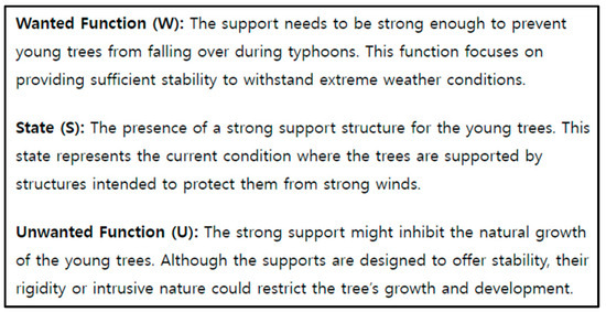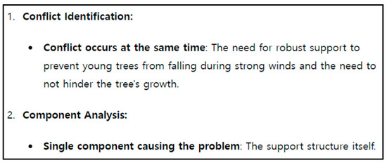 With the metadata constructed using ChatGPT, we defined contradictions to develop abstract solution strategies for new problems. A problem was solved to determine a support structure for young trees. While young trees need strong supports to prevent them from falling over during typhoons, such supports can hinder their growth. Therefore, we needed to create a support that would not inhibit growth while still preventing trees from falling over during strong winds. Since the learning of roles and the Butterfly Model was complete, the problem-solving process was initiated by defining the contradiction [17,18]. ChatGPT defined a contradiction as shown in Figure 4.