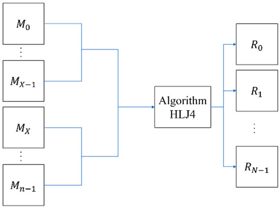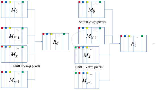Reference [9] used Algorithm HLJ1 to enable all secret images to be restored using two shares, then expands these two shares into n shares (Algorithm HLJ2), and finally adds the camouflage algorithm (Algorithm HLJ3). When restoring with this scheme, n shares are stacked by using the XOR operation to restore—after shifting the last N−X shares by (i−1)w/p pixels (Figure 3). All the shares are superimposed to perform the XOR operation and obtain the restored image i. Where N represents the number of secret images, X = ⌈n/2⌉, w is the width of the image, and p is a parameter that can be selected by the user.