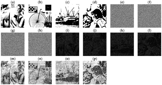 Experimental results by Huang et al.’s scheme with (a–d) Secret images S0, …, and S3; (e–h) shares M0, …, and M3; (i–l) OR-restored images R0, R1, R2, and R3; and (m–p) XOR-restored images XR0, XR1, XR2 and XR3.