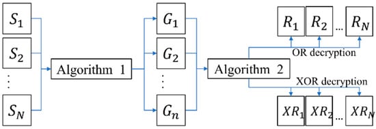 Huang et al. proposed an (n, n) XOR-based visual multi-secret scheme with meaningful shares [9]. Their approach incorporates three algorithms within the encryption process, whereas the decryption process consists of only a single algorithm. The encryption and decryption process are illustrated in Figure 1 and Figure 2, respectively.