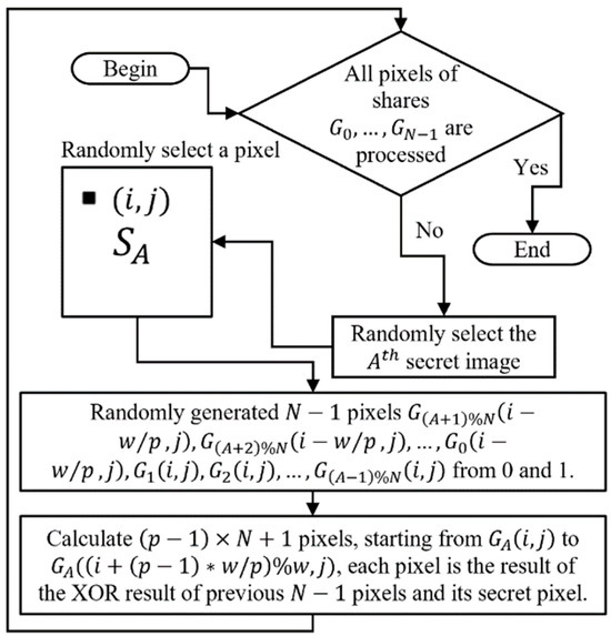 To provide a clear understanding of Algorithm 1, the flowchart is shown in Figure 6. In Algorithm 1, Step 4 calculates the pixel selected at the beginning, which is the (i, j) position of the A-th share, and its result is the XOR result of the corresponding secret image pixel and all randomly generated pixels in Step 3. We divide each share into p equal parts, with the k-th part of the second share () to the k-th part of the N-th share () and the (k + 1)-th part of the first share () to form a group. Before processing the entire group, we complete the calculations for the redundant parts in Step 5 to fully process groups in Step 6, which amounts to pixels. In Step 7, we calculate the remaining pixels (ranging from A to N, depending on the chosen A). The required calculations are finished once A, i, and j are selected. In other words, selecting A, i, and j generates randomly produced pixels and calculated pixels.