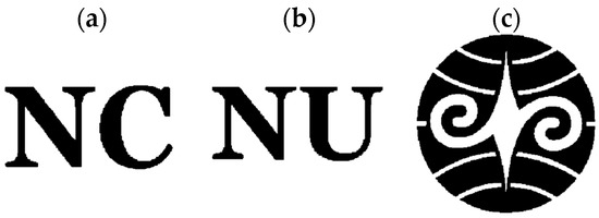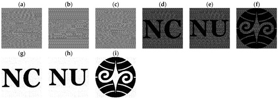 This subsection provides two experiments for a subsequent comparison with the method proposed in [9]. In the initial experiment, we encrypted three secret images, whereas in the subsequent experiment, four secret images were encrypted. All images measure 500 × 500 pixels in size, with the parameter p consistently set to 20 across both experiments. The three secret images utilized in the initial experiment are depicted in Figure 8a–c, whereas the quartet of secret images employed in the subsequent experiment correspond to those illustrated in Figure 4a–d. Figure 9 shows the first experiment result by the proposed (n, n) VMSSS. Where the OR-reconstructed image refers to the image reconstructed through the OR operation, the XOR-reconstructed image refers to the image reconstructed through the XOR operation.