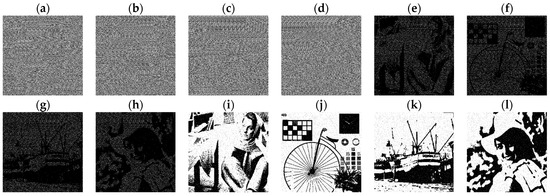 The second experiment results by the proposed (4, 4) VMSSS. (a–d) Shares G0, G1, G2, and G3; (e–h) OR-reconstructed images R0, R1, R2, and R3; and (i–l) XOR-reconstructed images XR0, XR1, XR2, and XR3.