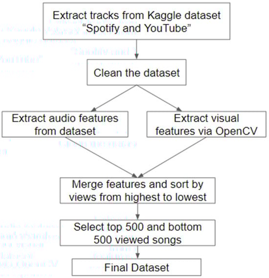 Figure 1 shows a flow chart of this research. Data were gathered from ‘Spotify and YouTube’ from 7 February 2023, including 20,717 songs on YouTube. The dataset was obtained from Kaggle. In total, 18 features were extracted, including 11 audio features and song information such as song title, artist, view count, etc. Data were collected from 13 April to 21 May 2023. After cleaning the dataset, 5 visual features were extracted using OpenCV and merged with audio features into a new dataset. The highest and lowest 500 songs in terms of YouTube views were labeled as popular and unpopular categories. Classification machine learning was used for audio and visual features.