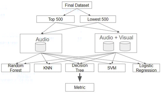 Figure 2 shows the structure of this research. Two experiments were conducted to showcase the significance of visual features in prediction. The first dataset contained audio features. In total, 5 distinct machine learning models were used. The second dataset containing audio and visual features was processed with the same machine learning models.