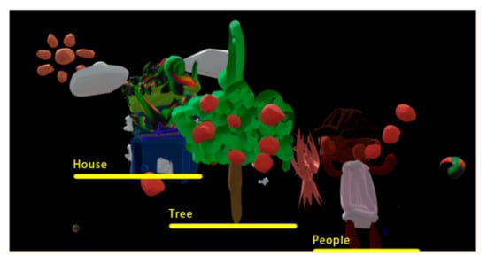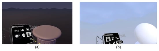 Once users become familiar with the controllers, they can completely control the device with uninterrupted engagement with the artistic flow. VR provides a novel private space, enabling users to enjoy freedom from real-world constraints, stressors, and tensions and facilitating entry into an alternative or imaginary space []. Users can better regulate spatial information and various factors through virtual environments, potentially alleviating anxiety and attention-related issues. VR virtual spaces allow for control over scene objects and their quantity, environmental information, and sky brightness (Figure 1).