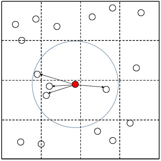 Algorithm 1 shows the Cell List algorithm, including the initialization of the cells within the grids (line 1). Algorithm 3 presents the pseudocode for the ‘calcForce()’ function of the Cell List algorithm. We obtain the list of surrounding cells to be calculated using the ‘getCellList()’ function and stored in the ‘CellList’ list (line 1). We then calculate the interaction only for the cells in the ‘CellList’ list (lines 2–4). Algorithm 4 presents the pseudocode for the ‘getCellList()’ function of the Cell List algorithm. Based on the address of the input cell, the corresponding grid is identified (line 5), and a list of cells belonging to the surrounding grids is created based on the grid search range (lines 6–8). From this list, only the cells within the search radius are selected for inclusion in a new list (lines 9–11) and returned to the caller (line 16). Each grid is assigned a grid number for identification. Here, columns are denoted as ‘gridX’ and rows are denoted as ‘gridY’, defining the grid as ‘(gridX, gridY)’.
