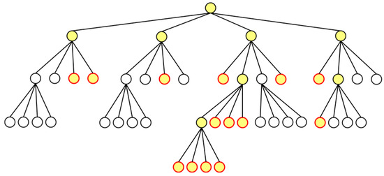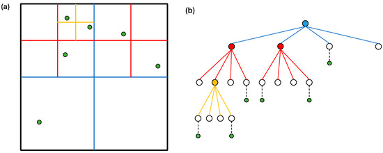 After constructing a tree and calculating the centers of mass, the Hybrid algorithm colors the tree. Figure 4a shows cell–cell interactions considered in the original Barnes–Hut algorithm. As an example, Figure 4b shows those in the hybrid algorithm; cells within the grids and the search radius are considered. Figure 5 shows the colored tree to compute the cell–cell interactions shown in Figure 4b.