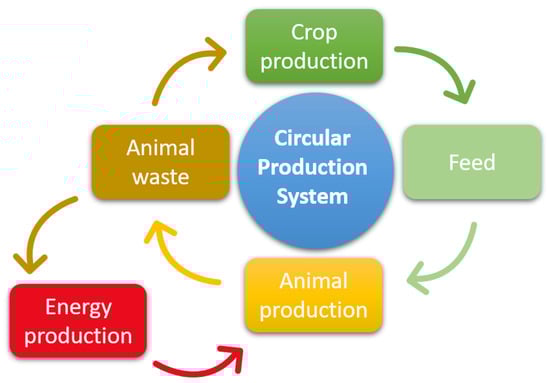 The circular production system can receive and process all the information from each subsystem installed at every production level in the farm and provides the results in a simple and manageable form, supporting users to make appropriate decisions (Figure 3). Examples of input data include: (a) for the crop production sub-system—weather and soil moisture data from IoT, satellite and drone images, and crop and soil properties mapping proximal sensor data; (b) for the feed production sub-system—silage moisture and temperature data from IoT; (c) for the animal production sub-system—animal housing environmental conditions (temperature, humidity, CO2 and methane concentrations, etc.) monitored using IoT sensing systems, animal health status (temperature, activity, and behavior) using wireless IoT-enabled collars; (d) for the animal waste treatment sub-system—waste volume, waste water content and temperature, produced volume of biogas (if equipped with biogas production facilities), using IoT systems.