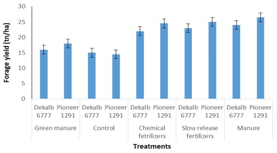Forage yield of the different treatments that were tested with two maize hybrids during the 2019 growing season.