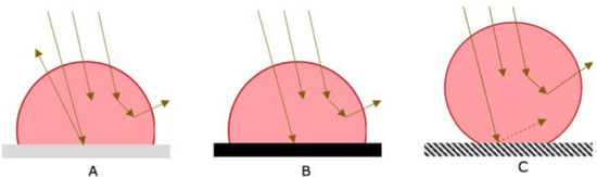 Visualization if (A,B) the transmitted light influences the reflected light for the different colored backgrounds, and if not (C). The striped surface for C indicates a similar result for both background colors.