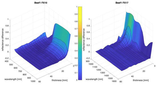Three-dimensional plots of thickness, wavelength, and reflectance difference for beef tomato sample 1.