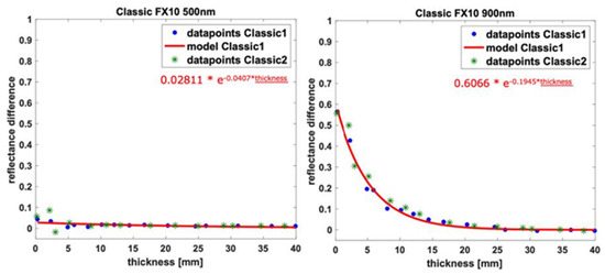 Between the thickness of 0 to 20 mm and wavelengths 600 to 1100 nm, a definite difference in reflectance between the black and white background was observed. For the other combinations of thicknesses and wavelengths, there was not a clear reflectance difference between the two different backgrounds (Figure 2). The reflectance values showed similar values for the different types of tomatoes. Exponential models were fitted for the six wavelengths. Figure 3 shows the data points of both samples and the fitted model on the first sample for the classic tomato at 500 and 900 nm. From this figure, the exponential relationship can clearly be seen for 900 nm. For wavelengths between 700 and 1300 nm and for the beef, classic, and cocktail tomatoes, the models showed comparable results. At 500 nm, for each type of tomato, the relation is more linear.