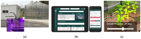 (a) AmI Seedbed and Intelligent Greenhouse, (b) snapshots of the web applications, (c) AR plant growth simulation.