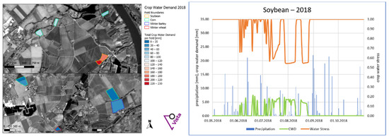 The crop water demand for some fields along the Bavarian–Austrian borders with different crop types such as soybean, corn, winter barley and winter wheat was simulated with the crop growth model PROMET for the year 2018 (Figure 2). In 2018, the soybean fields had the largest crop water demand which was not satisfied by precipitation, while the other crop types had significantly less crop water demand. Crop type assignment is very important for correct quantification of crop-specific irrigation water demand, and it differs from year to year, thus, it is important to simulate it with meteorological data and Earth Observation information.