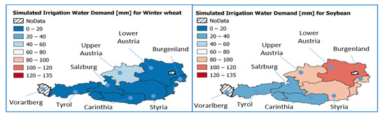 Irrigation water demand in mm for winter wheat and soybean for Austria in the year 2018.