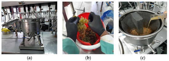 (a) Stainless steel fermentation tanks; (b) destemming of the grapes; and (c) initiation of spontaneous alcoholic fermentation.