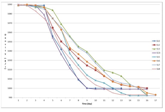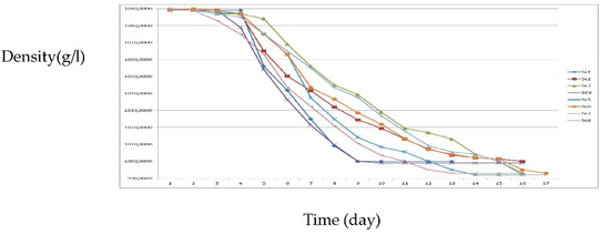 Phenotypic typing and characterization of S. cerevisiae isolates of the 76 isolates studied showed that 18 were identified as S. cerevisiae (Figure 3). S. cerevisiae were mainly derived from integrated grapes. They were found in grapes of the same variety (Malagousia) of the same sampling vineyard and repeated for 3 consecutive years, while in another PGI zone (Drama) they were isolated year after year, similarly at the same variety and vineyard each year. The same S. cerevisiae strain was identified in the wines produced from the grapes of the first case at the end of the fermentation. Therefore, in integrated grapes of a given area (Pangeon), the same strain was isolated in the grapes for every year of the process, before and at the end of the fermentation. In organic grapes, S. cerevisiae had a lower incidence. So, they were identified in a single case, in the middle of the fermentation, and in the same variety and area (Thessaloniki) for 2 consecutive years. Various species that were used to classify the genus Saccharomyces, but were eventually considered synonymous with S. cerevisiae, are named by many researchers as breeds or normal varieties [24] (Table 1). In order to distinguish various S. cerevisiae strains, δ1–δ2 and δ12–δ2 primers amplifying inter-delta sequences were employed [12]. Oenological properties: The results of the flocculation tests showed that most of the strains (89%) remained in suspension after 10 min [25,26]. The isolated strains had zero-to-medium ability of hydrogen sulphide production and zero malic and acetic acid production. All the strains had glucosidase, but low or no beta glucosidase activity. Regarding their enzymatic profile, α-fucosidase, N-acetyl β-glucosaminidase, esterase, esterase/lipase, leucine aminopeptidase, valine aminopeptidase, cystine aminopeptidase, trypsin, aminopeptidase, phosphohydrolase, and galactosidase were detectable. Although each strain had a unique enzyme pattern, the mean enzyme activity was esterase, lipase, and esterase/lipase with slightly higher activity. The action of N-acetyl β-glucosaminidase shows maximum enzymatic activity, 40 nmoles, in almost all strains except from one. Zero activity is shown by β-galactosidase, occurring only in one strain with very low activity, 5 nmoles. Alkaline phosphatase, α-chymotrypsin, and α-glucosidase were not detected in any of the strains. Alcoholic fermentations: Similar fermentation kinetics were observed in Sc2 and Sc6, Sc1 and Sc4, and Sc3 and Sc7. Higher fermentation rates and faster completion of the process were observed in Sc1 and Sc4. Two of the eight strains (Sc2, Sc4) did not metabolize the total initial sugars. Two strains gave wines with high volatile acidity. The duration of the fermentation varied from 9 to 17 days (Figure 4). At the end of the fermentations, a 750 mL centrifuged sample of each tank was taken for chemical analysis. In all cases, the pH values (3.56–3.89), alcoholic degree (11.75–12.95), volatile acidity (0.35–1.60 g acetic acid L−1), and total acidity (5.0–6.9 g tartaric acid l−1) ranged at usual levels [18,21]. Sensory analysis: Two months after fermentation, the lies were discarded and 3 bottles of each tank were prepared and tasted by a panel of 10 experts. Regarding the aromas, the conclusion for the overall assessment coincide with the individual assessments. From the average of the four indicators related to the aroma, some samples can be distinguished (those with the highest average values). Among these, one has an extremely low variability (standard deviation), which means that all its features are consistently high. The same sample gathered the best performance in the parameter “overall aroma rating”. This is important because it demonstrates the objectivity and effectiveness of the grading method.