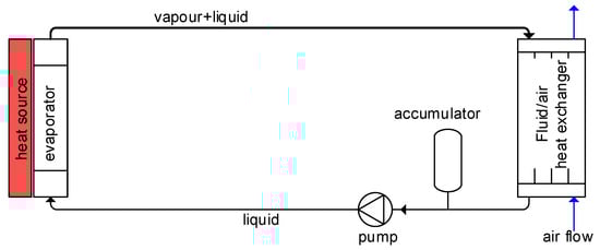 For the heat transport from power electronics to ambient air, an evaporator, a two-phase mechanically pumped loop (two-phase MPL), and a fluid–air heat exchanger are used, as schematically shown in