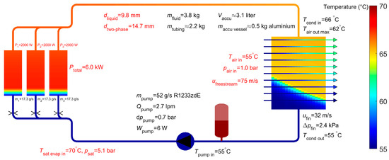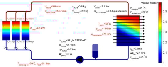 Figure 3, the conducted system analyses on the two-phase MPL with heat source and heat sink are shown, with R1233zdE as the working fluid. A saturation temperature of 70 °C is considered, resulting in a controlled system pressure of 5.1 bar(a). Three parallel heat sources are shown, each 2 kW. These three parallel heat sources each reflect the combined dissipated heat of two heat sources, with one on the topside and one on the bottom side of the cold plate section in a sandwich configuration. Three sections with 2 kW cooling performance result in a 6 kW total heat dissipation capacity. A flow of 52 g/s ensures a vapour mass fraction of a maximum of 0.7 at the cold plate outlet. In