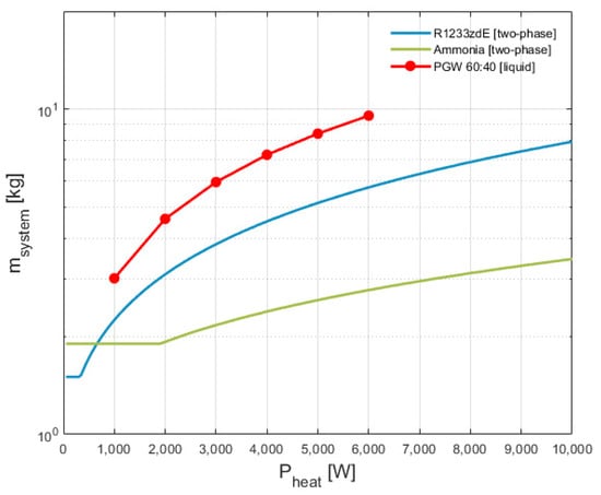 3) has superior performance but is toxic. Comparing mass on logarithmic scale, it can be seen that the system mass can be reduced by 40% when opting for a two-phase MPL with R1233zdE compared to a liquid MPL with propylene–glycol water. This mass reduction is 70% when considering ammonia as the two-phase MPL working fluid.