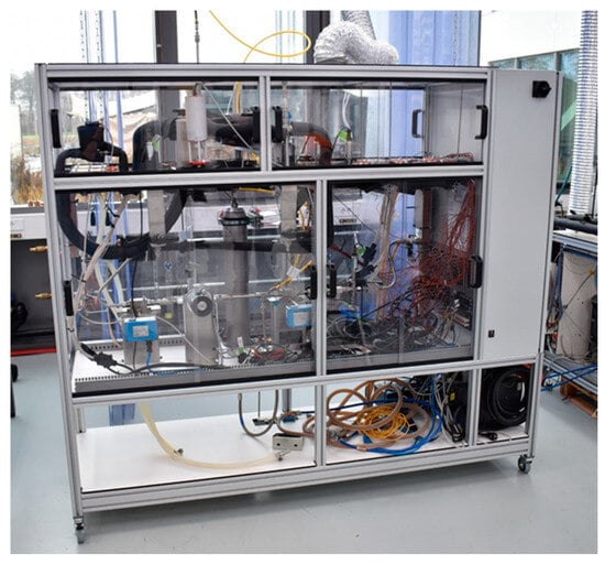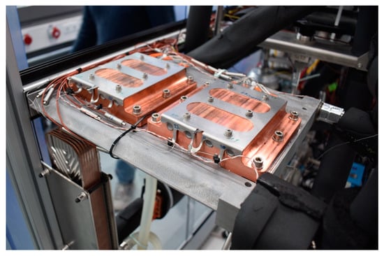 Figure 6. In this setup, cold plate designs can be tested by drop-in and several modularity configurations can be replicated. The system has shown its ability to transfer up to 10 kW of heat from heat source to sink, with R1233zdE as the working fluid.