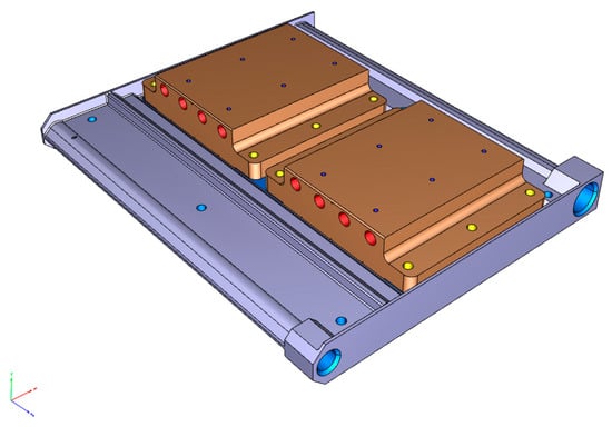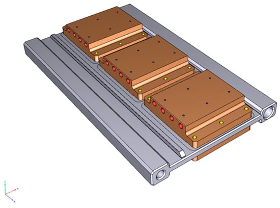 Figure 10. The orange-coloured blocks are copper blocks that serve as thermal emulators of HVDC converters. Embedded cartridge heaters in the copper blocks generate heat in a controlled manner. A heat flux of 7.7 W/cm