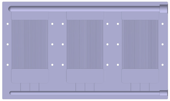 For the detailed design of both cold plates, the internal geometry dimensions were the same. For the additively manufactured cold plate, however, a reduction to 2/3 of the size of the machined cold plate was applied due to the manufacturing envelope. Therefore, its heat absorption capacity was reduced to 4 kW. The additively manufactured cold plate was manufactured as a single piece, employing its inherent manufacturing benefits. The machined cold plate was assembled as a two-piece design, with a braze line along the midplane of the design.
