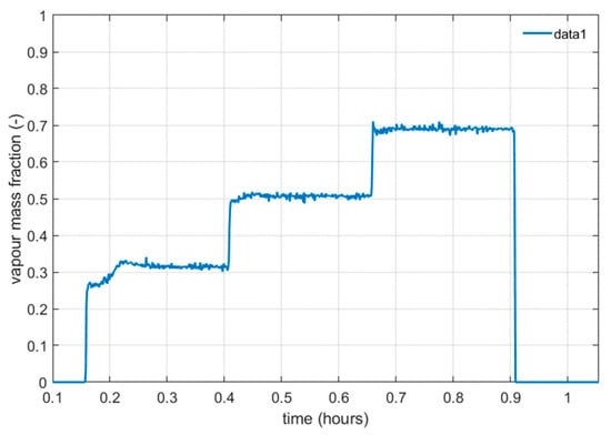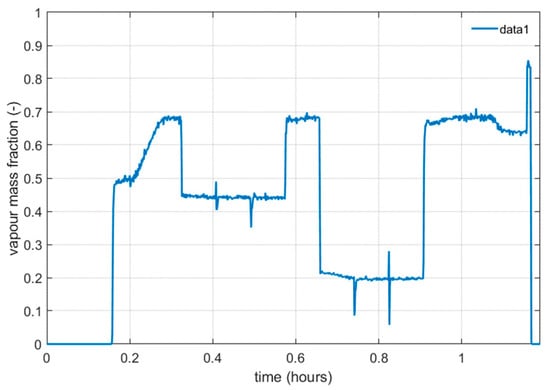 Figure 14. Due to the thermal inertia of the system, the vapour mass fraction is increasing during the test phase at 2 kW between t = 0.25 h to t = 0.50 h. The recuperator is causing this inertia. At 4 kW and 6 kW heat loads, constant vapour mass fractions of x = 0.45 and x = 0.69 are observed.