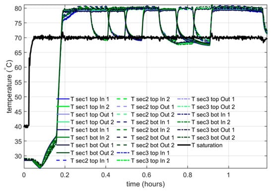 As part of the test campaign on the system’s modularity, a test was carried out with unbalanced heat load. Here, the machined cold plate was used for testing. An alternating sequence of the heat loads on the six heat sources was applied. The following sequence was applied: 1-1-1, 1-1-0, 1-0-1, 0-1-1, 1-1-1, 1-0-0, 0-1-0, 0-0-1, 1-1-1, where “1” indicates full load and “0” indicates zero load on the section. As highlighted in