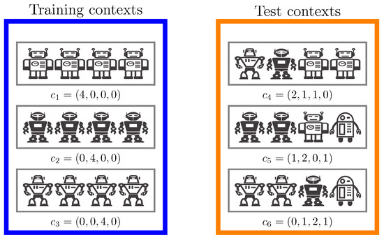Figure 4 shows how robot team composition can be represented as context. Using RL algorithms, e.g., Soft-Actor Critic (SAC) [31], we can now learn a context-dependent policy to solve the tasks dependent on a given context c. By sampling two different sets of contexts and , we can effectively and reliably evaluate how well the learnt policy can generalize to unseen situations. Additionally, the learnt context-dependent value-function can be used to inform the team selection process for the task at hand to select the ideal team composition for each new task.