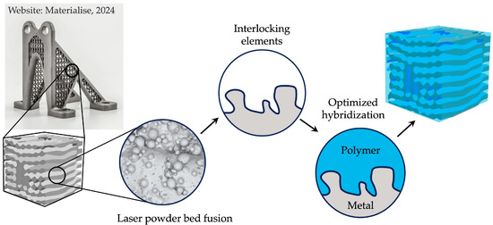 Metamaterials are rationally designed structures made of a geometrically tailored composition. Especially for mechanical metamaterials, these properties range from highly tuned elastic to nonlinear, multistable and programmable ones. Even auxetic or chiral mechanical behavior and specific wave propagation [1,2,3] can be achieved. In the modern aviation industry, lightweight construction and efficiency play a central role, which is why functionally integrative lightweight structures are necessary to meet future requirements. One of the key technologies for manufacturing complex, functionally integrative metal components is the LPBF process. Spinodoid structures are an example of biologically inspired, non-periodic shapes, such as those which are characteristic in bones and can only be manufactured with 3D printing processes. In aerospace applications, there is also the challenge of withstanding extreme environmental conditions. The change from large temperature extremes promotes corrosion and leads to the degradation of the material and, as a result, to component failure. To protect against extreme environmental conditions, metal components in aviation are protected with plastic coatings or paintwork or even completely substituted with a fiber-reinforced plastic component [4], which, however, can be extremely cost-intensive. For this reason, metal–plastic joints are of great interest. A metal–plastic joint requires a high level of adhesive strength, which is based on certain adhesion theories. According to Amend [5], adhesion theories are categorized into mechanical and specific adhesion theories. Mechanical adhesion is defined as the interlocking of the joining partners. On one hand, this can be carried out at a macroscopic level by adapting the component geometry [6] or at a mesoscopic level by creating pin-like geometries on the surfaces of additively manufactured components [7]. On the other hand, the joint strength can also be influenced by the surface roughness of the metallic component [8]. The influence of the scanning strategy in the LPBF process on the surface roughness has been investigated in various publications. The most important influencing variables are [9,10,11,12] the volumetric energy density , which is composed of the hatch distance ; the power of the laser ; the scan speed ; and the layer thickness .