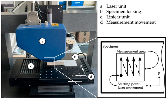 The second method used to explore the surface topology is the laser profilometry, which is determined by the arithmetic surface roughness and is defined in DIN EN ISO 25178 [20]. Figure 3 shows the measurement setup of the laser profilometer from Nanonfocus with the respective sample alignment. To reduce the measurement time, the scanning direction was set in the layer surface direction (x) with a finer resolution and in the layer growth direction (y) with a reduced resolution. Based on the surface analyses via SEM, the resolution parameters of the laser scanning could be determined. The roughness of LPBF-printed surfaces was determined, on one hand, by the size distribution of the powder particles from 10 µm to 45 µm and the resulting balling effects and, on the other hand, by the hatch distance of 120 µm. These geometric effects should be measured with at least 10 scans. For this reason, the x-axis was scanned at a rate of 15 µm and the y-axis at a rate of 1 µm. The measurement area was 5 mm × 5 mm.