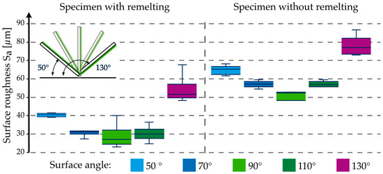The results of the roughness measurement using laser profilometry are compared for all variants in Figure 4. The stainless steel test specimens produced using the LPBF process exhibit an average roughness of 27.14 µm (90° overhang angle with remelting) to 77.07 µm (130° overhang angle without remelting), depending on the overhang angle. Extreme overhang angles such as 50° and 130° each exhibit the highest roughness in the test series. Vertical overhang angles of 90° show the lowest roughness in the test series with and without remelting. The comparison of the extreme overhang angles shows a higher roughness for 130° samples than for 50° samples. This can be explained by the reduced heat dissipation in the case of downskin surfaces due to the metal powder underneath. When comparing samples with and without remelting, a 20–25 µm higher arithmetic surface roughness is achieved on samples without remelting.