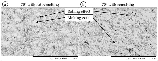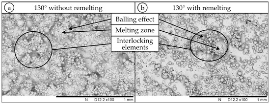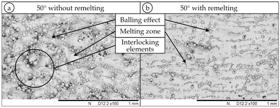 When comparing the SEM images of samples with an overhang angle of 70°, there is also a larger number of powder buildups (balling effects) observed in the case of no remelting (Figure 6a). In contrast to an overhang angle of 50° (Figure 5), these balling effects occur in all areas. The melting zones in Figure 6a are diffuse and unstructured. There are more interlocking elements in Figure 6a compared to Figure 6b but fewer than in Figure 5a. In case of remelting (Figure 6a), powder buildup appears along the melt zones and follows a clear pattern.