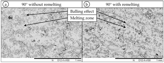 In Figure 7, SEM images of samples with an overhang angle of 90° are compared. The surface appears very similar with and without remelting. An equal number of powder buildups can be detected. Similar to Figure 6b, there are little to no interlocking elements.