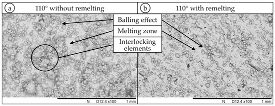 SEM images of samples manufactured with an overhang angle of 110° are shown in Figure 8. The sample without remelting (Figure 8a) shows a larger number of powder buildups. The balling effects are distributed without any indication of structuring in all areas. The melting zones are diffuse and unstructured. There are more interlocking elements compared to the sample with remelting (Figure 8b). They resemble the samples with an overhang angle of 70° (Figure 6).