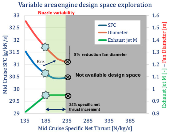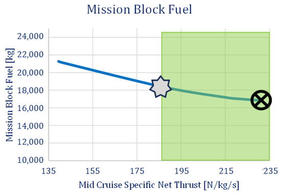 After a SpFn of 214 N/kg/s, the fan sizing point switches from ETR to MTO, causing the kink point in the SFC curve. This is due to the increased MTO corrected mass flow. Further details on this, as well as the thermodynamic aspects regarding these two cycles, are offered in [14].