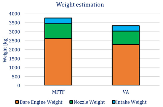 the required engine mass flow for this condition.For the same noise limitation at take-off, applying the VA configuration increases the engine SpFn by ~24%, corresponding to an overall 8% fan diameter and ~0.6% SFC reduction, respectively, as shown in Figure 3. Overall, this correlates to a 15.6% reduction in weight, as illustrated in Figure 4 which shows the weight assessment for both cycles.