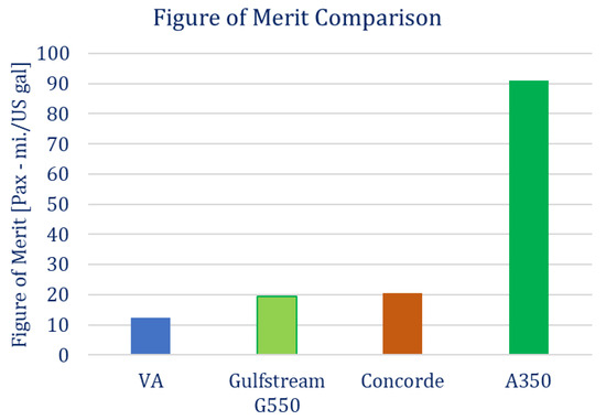 Figure 6 below shows a useful PAX-mile/US gallon comparison between the VA engine and the Gulfstream G550, a subsonic business jet flying a comparable distance for a maximum of 20 passengers, Concorde, and the Airbus A350. The reference Concorde value is obtained from [14], while Gulfstream FOM is calculated from the referenced overall MFB and the reference mission distance, assuming the maximum number of passengers. As expected, the VA FOM is low compared to current subsonic business jets and to Concorde. FOM is influenced by several parameters including weight, drag, propulsive efficiency, range, operational profiles, and design speed. Business jets are usually less fuel efficient than airliners, with worse payload-to-weight ratios and operational profiles, due to their higher flight speeds and reduced lift-to-drag characteristics. Supersonic business jets exhibit these characteristics at an even higher degree.