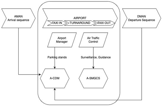ASTAIR’s concept targets large airports that handle commercial flights. It is interconnected with the airport’s networks and implements several basic concepts, like airport collaborative decision making (A-CDM) and advanced surface movement guidance and control systems (A-SMGCS). These constraints are driven by the need to obtain reliable information about the flight schedules and taxi operations to feed the ASTAIR AI as illustrated in Figure 2. The disadvantage is that this also means that large airports with many stakeholders will need to share their data and constraints. Focused on ground operations, the current airport operations can be summarized as the management of two sequences: arrivals and departures.