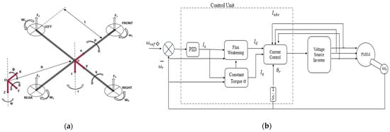 (a) Schematic representation of the quadrotor platform, taken from [17]. (b)Schematic representation of the PMSM system and its control unit.