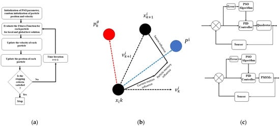 (a) Flow chart of the PSO algorithm based on [19]; (b) Process of searching for a new position in the PSO methodology; (c) Schematic representation of how the PSO framework is used for optimizing the PID parameters of both quadrotor and PMSMs’ controllers.